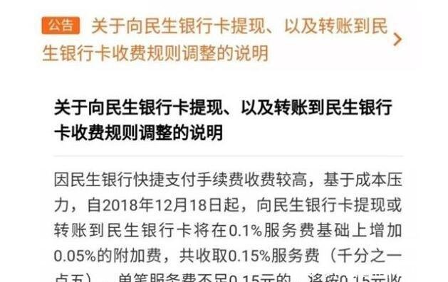 这项新的规定,同样是跟微信的提现有关系的,这部分网友一定要注意了,特别是一直使用民生银行储蓄卡的用户,因为在本月的18号,微信对于民生银行的用户在提现方面以及用户转账方面的费率,由之前的千分之一提升到了千分之一点五,请大家一定要看清楚了,这个是针对于民生银行的用户的,其他银行的还是跟以前都一样的,虽然这是一件小事,但是还是引起了网友们的一阵热议。