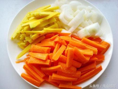 2、把胡萝卜、黄萝卜洗净去皮切粗丝,洋葱切小丁,姜切末、鸡小腿洗洗
