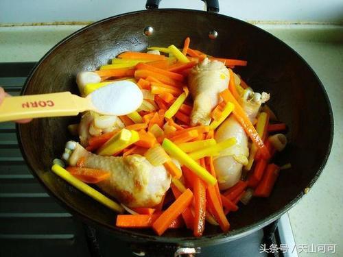 5、加胡萝卜和黄萝卜放入锅中翻炒,要不断地翻炒,最好炒出香味变软,加盐翻炒均匀