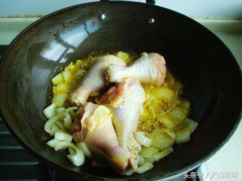 4、加鸡小腿、姜(可选)翻炒出香味,要不断地翻炒,这样为了避免糊锅,最好把鸡腿外皮炒出微微发卷