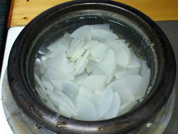 2.放入小锅里面,加水,淹没萝卜片,然后点火烧开后,再改用小火煮15分钟即可。