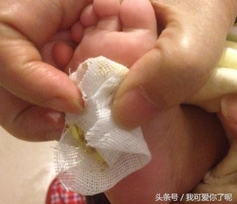 6、包一晚上就可以了,第二天拆下来,可以看到姜粒变干,这就是被孩子身体吸收了。孩子可能会口渴,记得给孩子喂点水。