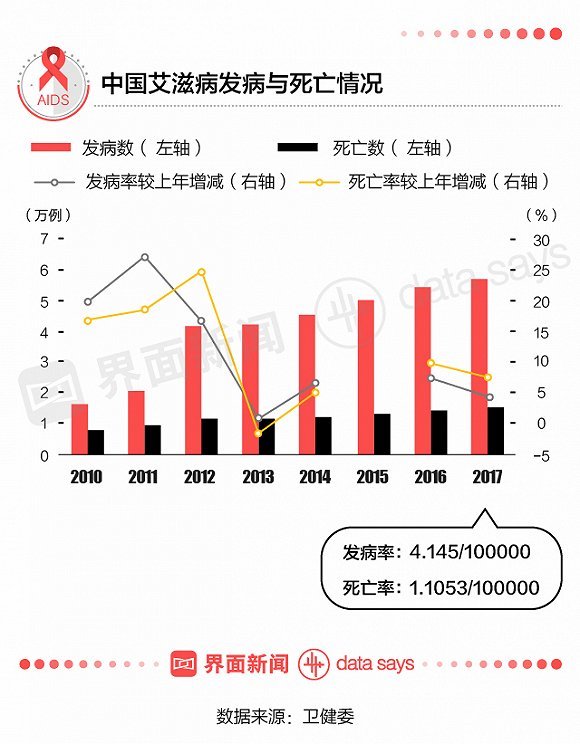 卫健委数据显示,近年来中国艾滋病发病率和死亡率增速出现下降。2017年,中国艾滋病发病率约为十万分之四,死亡率约为十万分之一。