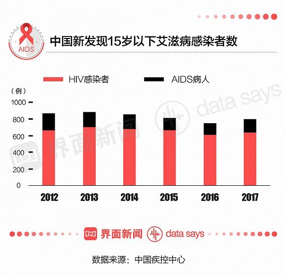 从年龄来看,2017年有近800位新发现艾滋病感染者的年龄在15岁以下。