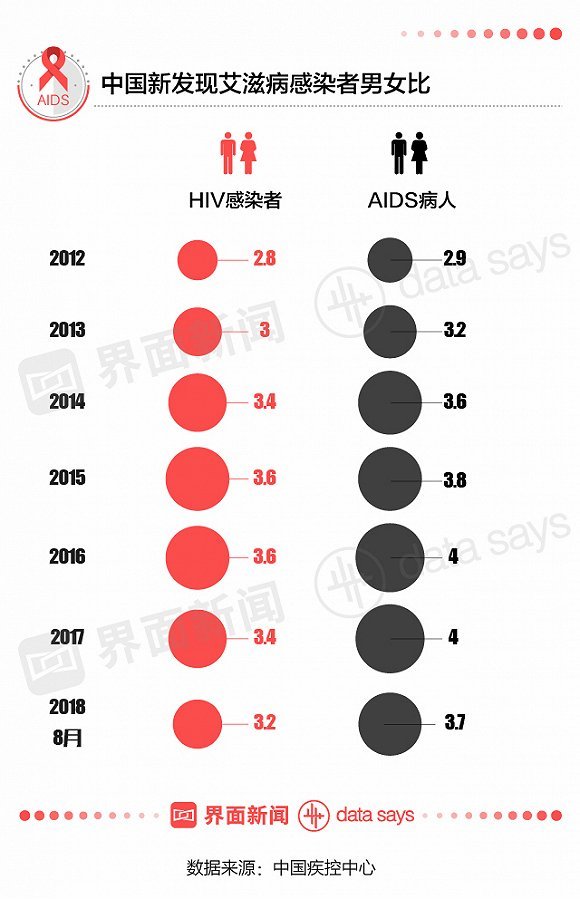 从性别来看,在中国每年新发现艾滋病感染者中,男性数量约为女性的三倍。