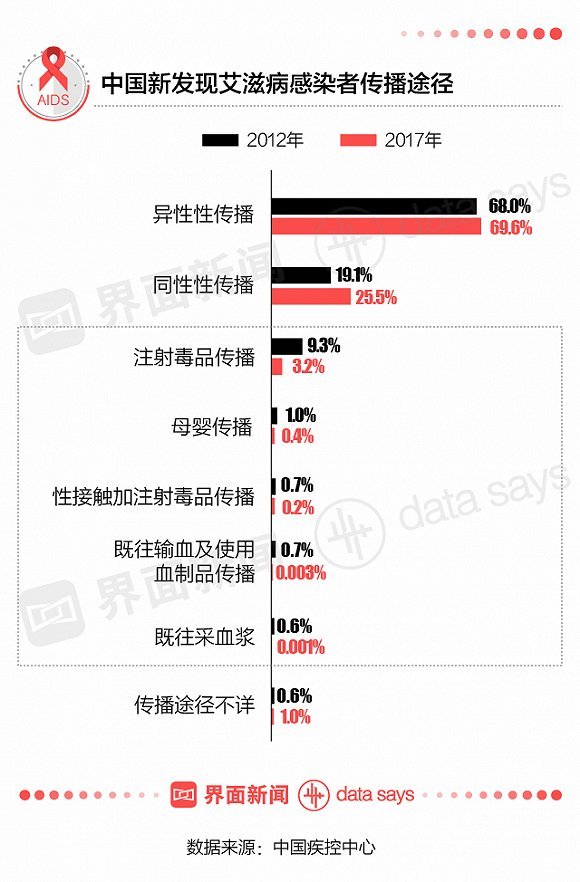 从传播途径来看,中国艾滋病防控工作取得显著成效,输血传播已基本阻断,经注射吸毒传播得到有效控制,母婴传播率处在历史最低水平。性传播是当前艾滋病的主要传播途径,占比超95%。