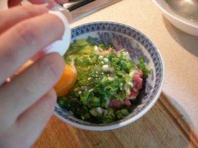 2、绞肉加上准备的全部原料朝一个方向搅拌好备用。