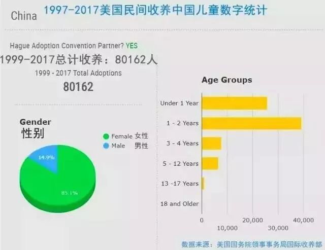 据美国国务院领事事务局国家收养部的数据显示,从1992年至2017年,美国民间收养中国儿童的数字达到了80162人。